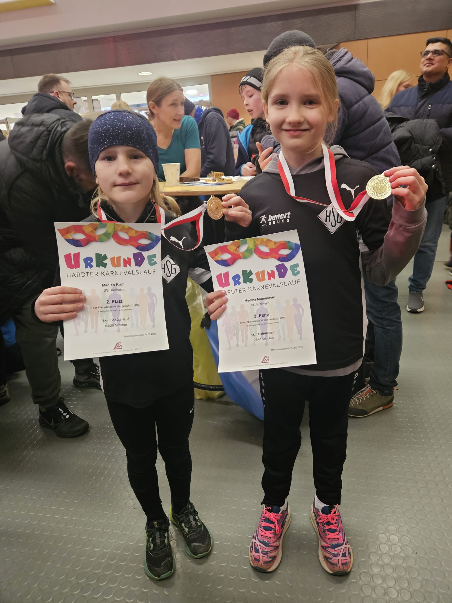 Am 14.02.2026 gingen die jungen Läuferinnen und Läufer der SG Holzheim beim Hardter Karnevalslauf in Mönchengladbach an den Start. Bei bewölktem, aber sehr kaltem Wetter stand für alle Kinder die 1000-Meter-Distanz auf dem Programm. In einem großen Teilnehmerfeld mit vielen bunt verkleideten Kindern herrschte bereits beim gemeinsamen Einlaufen eine fröhliche und motivierte Stimmung.