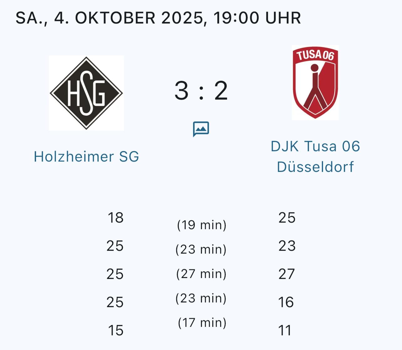 Es begann im ersten Satz ein offener Schlagabtausch, mit den ersten Punkten für die Holzheimer SG. Im weiteren Verlauf konnten die Gäste aus Düsseldorf den ersten Durchgang allerdings mit 18:25 für sich entscheiden.